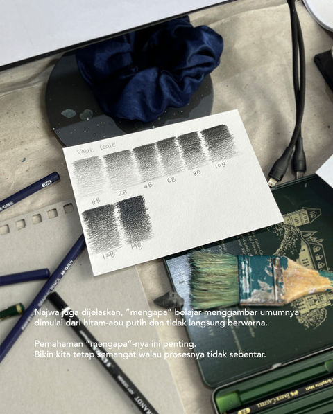 Pengenalan dan praktek menggunakan media gambar dan lukis secara bertahap (pensil grafit 👉🏻 pensil warna 👉🏻 cat air 👉🏻 cat akrilik